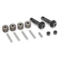 Zestaw zębatek do wymiany dyferencjału zawiera zęby wyjściowe (2), wałek zęba wyjściowego, zęby planetarne (4), wałki zębów planetarnych (4) oraz spacery dyferencjału (2).