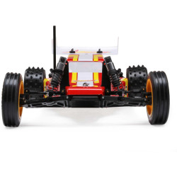 Legendarny model RC buggy w skali 1:16, Losi JRX2, to połączenie retro stylu z nowoczesną elektroniką i układem napędowym. Wyposażony w 5-punktowe tylne zawieszenie z aluminiowymi amortyzatorami olejowymi oraz silnik umieszczony za tylną osią, co zapewnia maksymalną przyczepność na torze. Kierunkowe przednie opony gwarantują precyzyjne prowadzenie, a tylne opony z kolcami zapewniają maksymalną przyczepność. Płyta podwozia z laminatu zapewnia sztywność konstrukcji. Model posiada charakterystyczną karoserię JRX2, mocny silnik szczotkowy, akumulator LiPo oraz aparaturę RC 2.4GHz, co razem dostarcza niesamowitych wrażeń z jazdy.